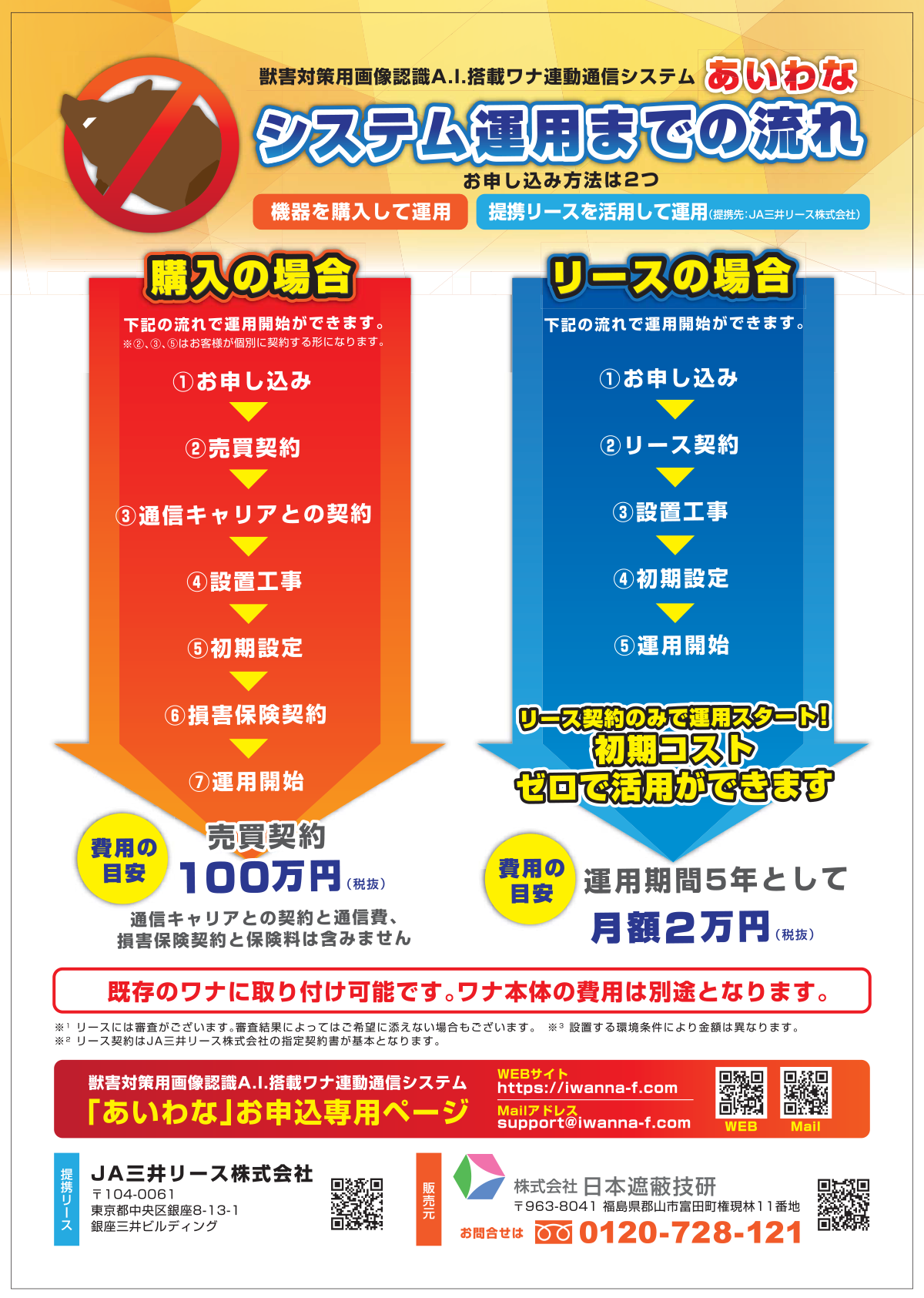 獣害対策用画像認識A.I.搭載 ワナ連動通信システム「あいわな」のご案内 2021.03.04NEWS&TOPIC Post Share Line RSS 投稿者: flowerinfo NEWS&TOPIC コメント: 0 「あいわな」ご案内・お申込みページプレオープンのご案内 鳥獣被害対策に活用出来る機器情報として農林水産省のHPで紹介... コメント ( 0 ) トラックバックは利用できません。 この記事へのコメントはありません。 関連記事一覧 罠連動警報通信システム「あいわな」のCMが公開されており... 経済産業省 FM番組 「First Maker〜希望のス... あいわな®シリーズのAIを開発している一般社団法人新生福... 害獣出没早期警報システム「あいわなクラウド」の紹介動画が... 2022年<<夏のあいわな®︎キャンペーンを始めました! 鳥獣被害対策に活用出来る機器情報として農林水産省のHPで... 獣害セキュリティサービス「あいわなⓇクラウド」が農林水産... 「あいわな」ご案内・お申込みページプレオープンのご案内